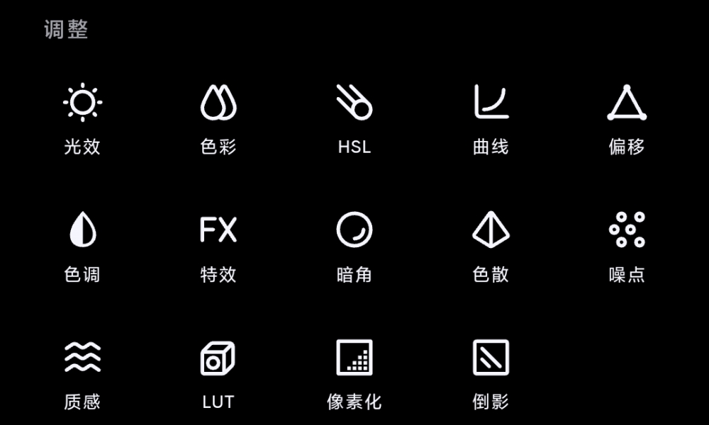 • 全局调整:光线、颜色、HSL、色调、效果、边缘、细节、曲线、晕影、颗粒、LUT